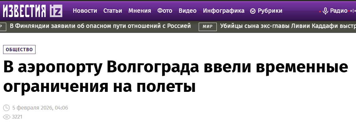 2月5日上午,俄罗斯联邦航空运输局在Telegram频道上宣布,在伏尔加格勒空港,已对飞机飞行实施临时限制。